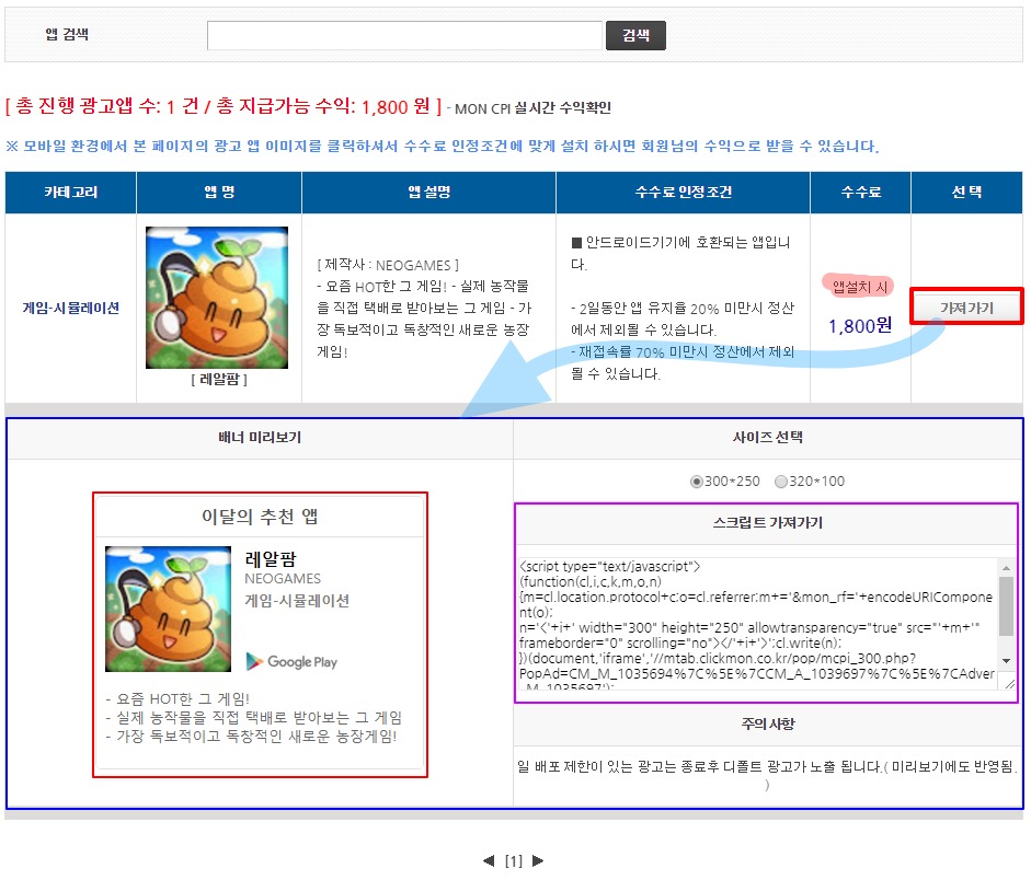 - MON CPI배너는 회원님께서 원하시는 광고주를 선택하시고 가져가기 클릭 후 스크립트 복사하셔서 회원님의 사이트에 적용하시면 됩니다. ( 단. 가져가신 배너의 광고가 종료 및 일배포 제한 되었을시 자동으로 디폴트 광고가 보여집니다. )