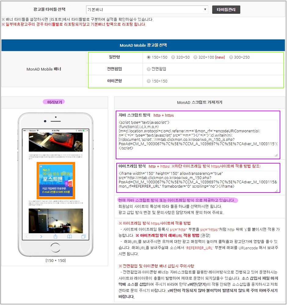 - Mobile : 일반형 150*150 사이즈 광고를 출력하고자 한다.