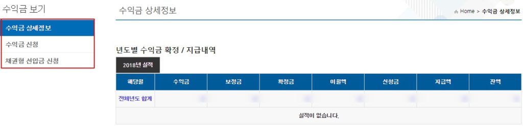수익금 상세정보를 확인 할수 있으며 또한 지금까지 얻은 수익에 대하여 신청을 할수 있습니다.