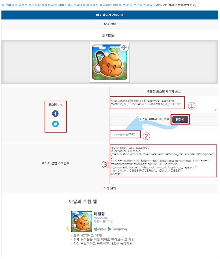 “가져가기”를 클릭하면 위 이미지에서와 같이 미리보기와 광고용 스크립트가 표시가 됩니다.