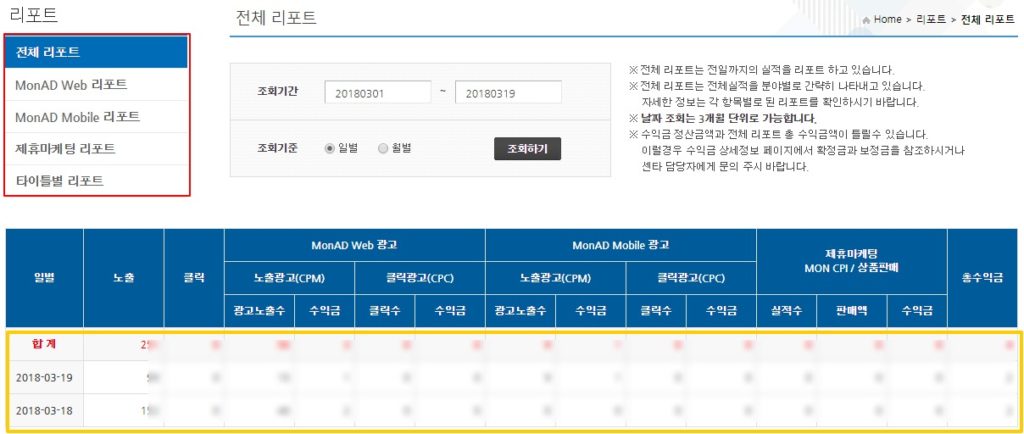 - MonAD 광고 리포트는 익일날 확인 가능 하며 제휴마케팅 리포트는 실시간 확인 가능합니다.
