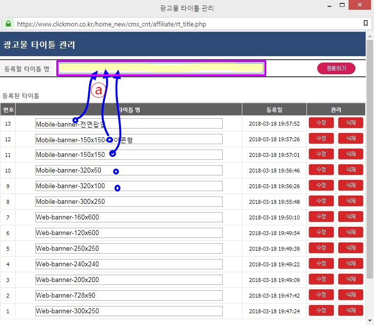 각각의 광소 사이즈별로 광고물 타이틀을 만들 수 있습니다.