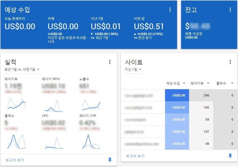 그에 앞서 애드센스에 로그인을 하면 표시되는 대시보드(Dashboard) 즉, 전체적인 관리 화면에 대하여 간략하게 소개 하겠습니다.