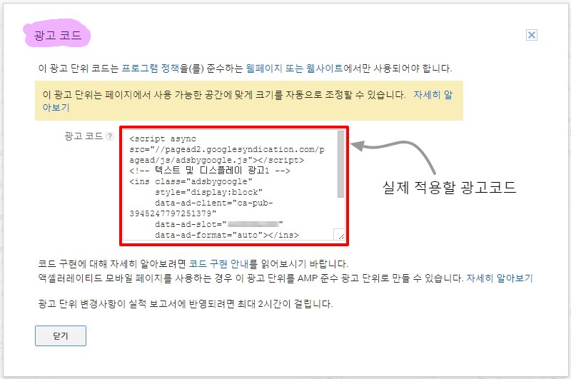 위 이미지에서 보라색 부분의 “[코드 가져오기]“를 클릭하면 아래와 같이 실제 사용할 광고코드 소스가 표시됩니다.