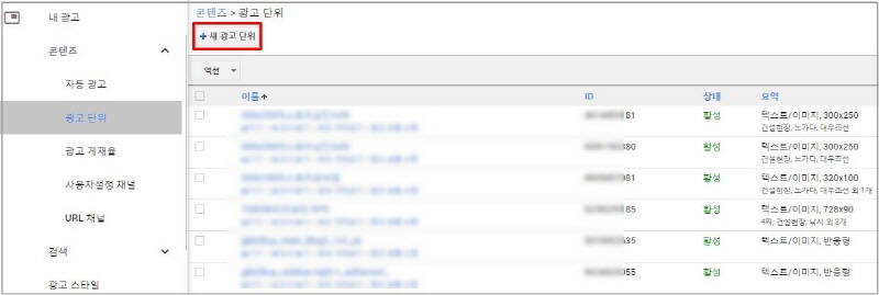 내광고 > 광고단위 > +새 광고 단위 를 클릭하면 새로운 광고를 만들 수 있습니다.
